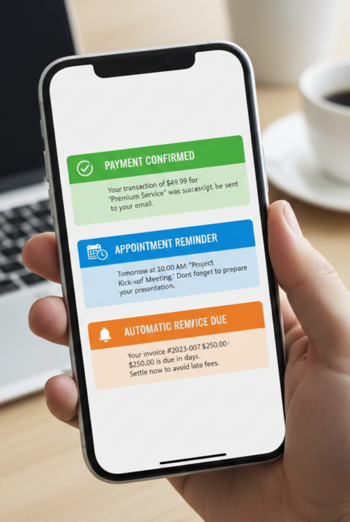 Send confirmations, reminders, and payment links instantly.